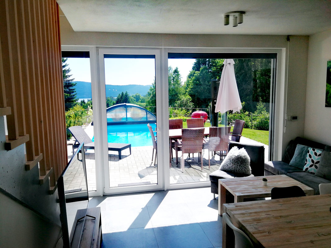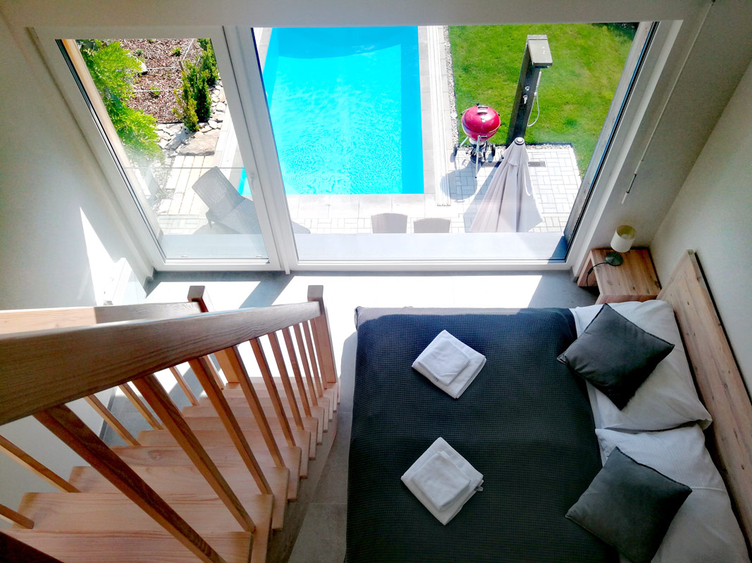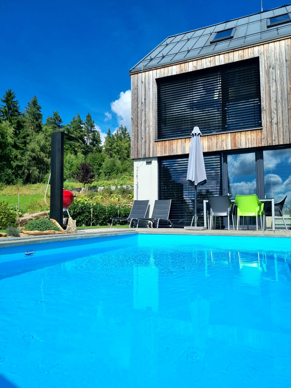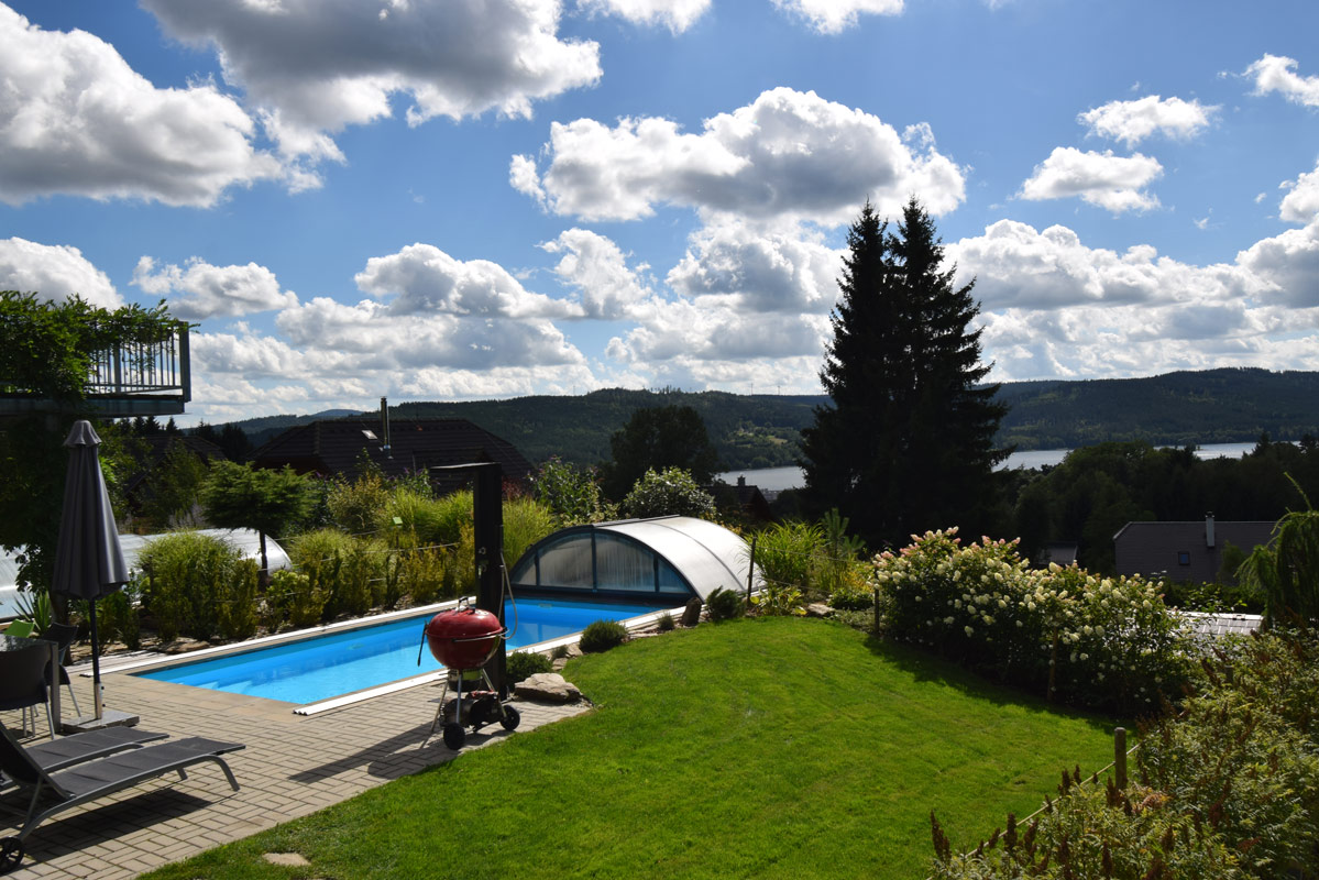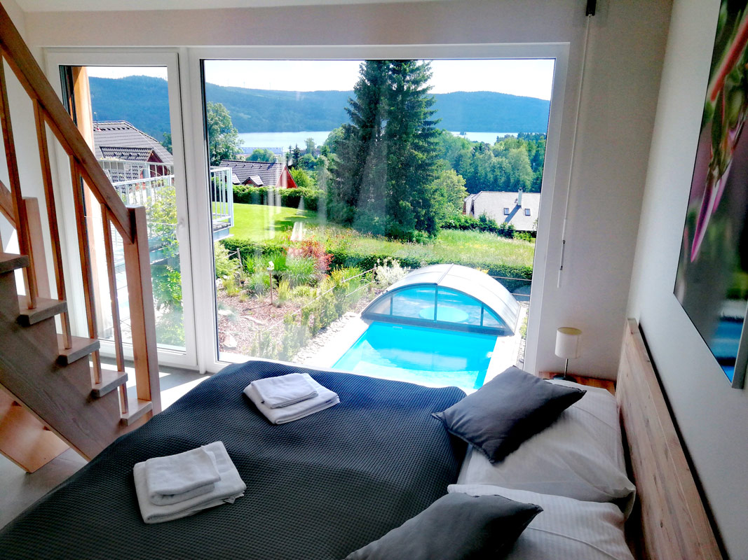 Třípodlažní apartmán pro 4-6 osob s celkovou vnitřní plochou 82 m2, infrasaunou, vlastním zastřešeným venkovním bazénem o rozměru 6 x 3 m a hloubce 120 cm (využití cca květen-září), venkovní solární sprchou a terasou s krásným výhledem na Lipno.