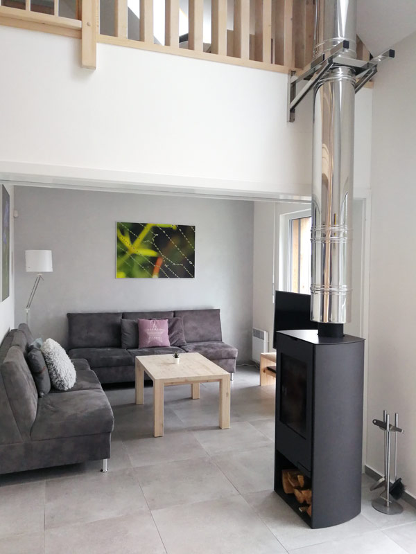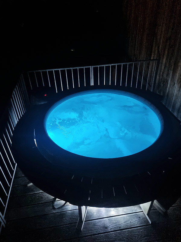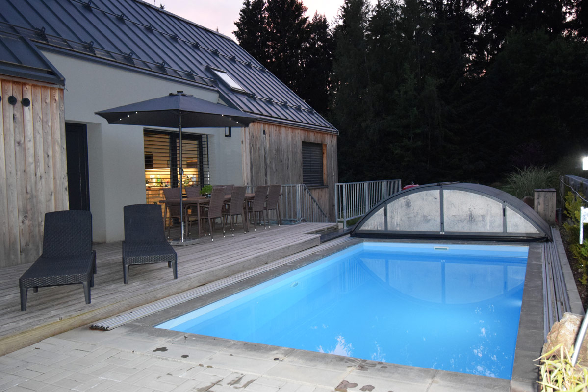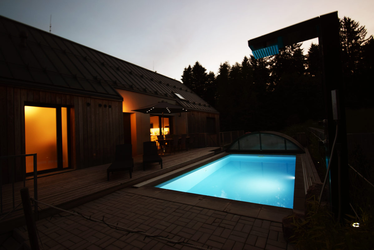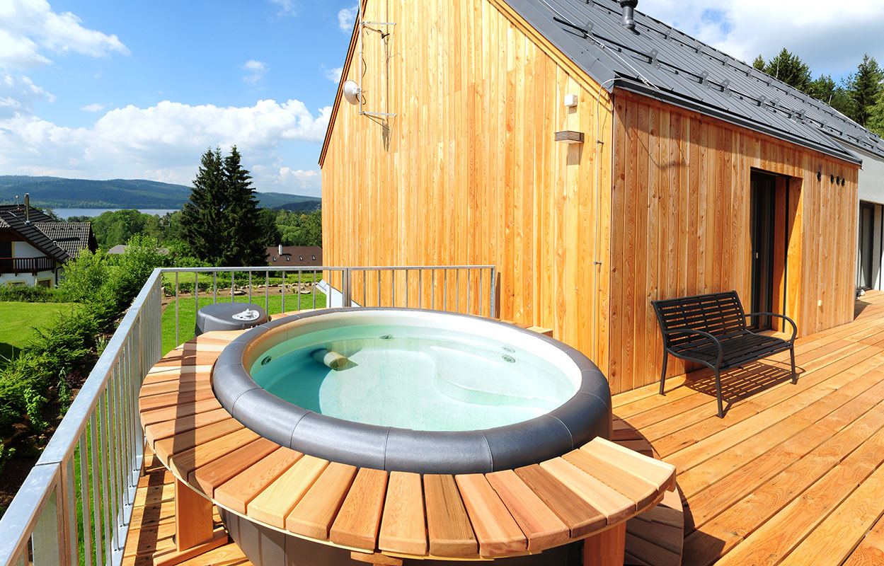 Dvoupodlažní apartmán pro 8 osob s celkovou vnitřní plochou 113 m2, s vlastním zastřešeným venkovním bazénem o rozměru 6 x 3 m a hloubce 150 cm (využití cca květen-září), venkovní solární sprchou, finskou saunou, krbovými kamny na dřevo a vlastní venkovní vířivou vanou (provoz říjen - duben), velkým balkonem a dřevěnou slunečnou terasou s krásným výhledem na Lipno.